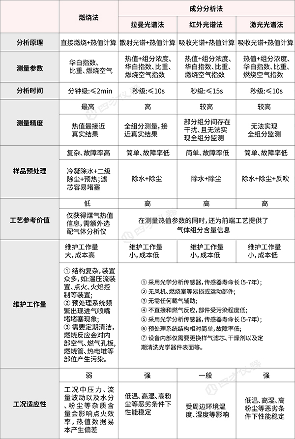 由表2可知,光学分析法对比燃烧技术,在样品预处理系统、环境适应性、维护工作量等方面具有明显优势,且能够同时测量煤气组分和热值数据,对工艺优化指导意义更大。而燃烧法设备虽然测量结果最接近真实值,但是整体结构相对复杂、预处理系统故障率高,维护工作量大,仅有热值数据对工艺指导意义弱,且本身检测方式也存在安全生产管理的潜在风险。此外,如今市场上成分分析法检测热值已经是主流技术:除了尤尼、赫伯等几家一直做燃烧式热值仪的厂家外,国内外一线分析仪厂家艾默生、梅特勒托利多、ABB、赛默飞、西门子、约克、西克、岛津、理研、E+H、Bruker、川仪、聚光、四方、雪迪龙等对于煤气品质的检测,均是以成分检测为主,鲜有向燃烧检测方向发展。综合来看,光学成分分析法可作为煤气热值计量的优选方法。