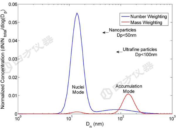图1 柴油发动机尾气排放中颗粒数量浓度(蓝色)和颗粒质量浓度(红色)的粒径分布曲线(Zhang et al 2014)