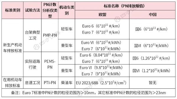 为了控制机动车尾气的超细颗粒排放,欧盟于2011年首次将颗粒计数法纳入到了新生产机动车排放法规体系(Euro 5b轻型车排放标准)。随后,颗粒计数法在欧盟新生产机动车排放法规体系中得到了全面和深入的发展,适用范围覆盖了轻型车和重型车,试验方法扩展为台架典型工况和实际道路行驶,2024 年 5 月 8 日发布的Euro 7标准中还将PN计数的粒径范围从>23nm升级为>10nm。为了同步管控机动车在用周期内的超细颗粒排放,欧盟委员会2023年3月20日发布了《装备压燃式发动机的车辆定期技术检验中颗粒数量测量的建议》,用于协调整个欧盟范围内有关在用柴油车尾气排放颗粒数量检测的相关要求。