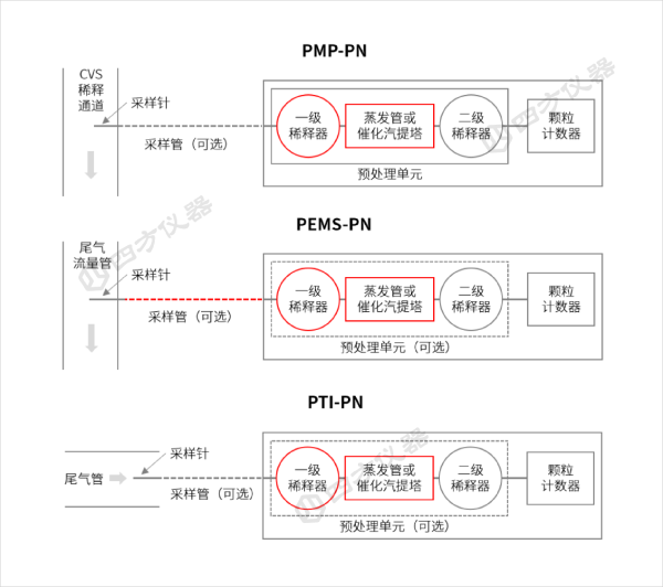 图2 PMP-PN、PEMS-PN和PTI-PN分析仪的系统结构(虚线或虚线框指示可选部件;红色指示加热部件)