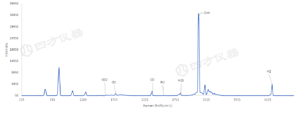 LRGA-3200EX对煤气化装置洗涤塔出口中粗煤气样品进行拉曼光谱扫描分析得到的拉曼光谱图(图4)显示,CO、CO2、CH4、H2S、H2、O2和N2等组分具有可区分的特征峰,通过计量特征峰峰高可同时测定各组分气体的含量。