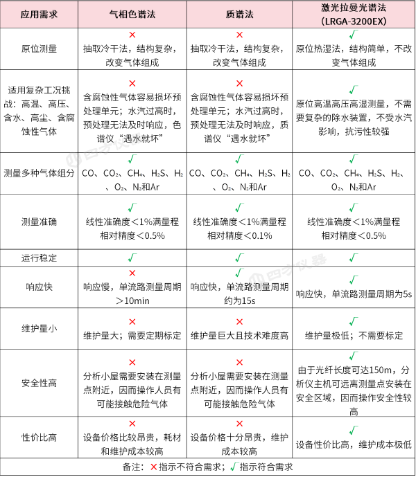 针对煤气化装置粗煤气在线检测的主要应用需求,气相色谱法、质谱法和激光拉曼光谱法(LRGA-3200EX)三种方案的技术对比(表1)显示: