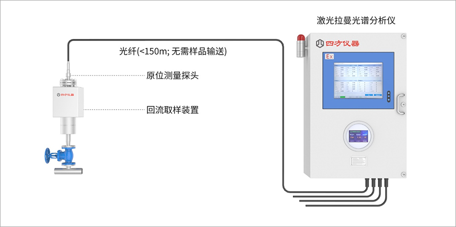 为了更好满足工业过程控制多组分气体检测的实际应用需求,四方仪器新开发了LRGA-3200EX原位激光拉曼光谱气体分析仪(图3)。LRGA-3200EX主要由取样装置、原位测量探头、光纤、激光拉曼光谱分析仪和系统软件组成,具有测量气体物种多、功能全面、安装方便、快速、准确等特点。