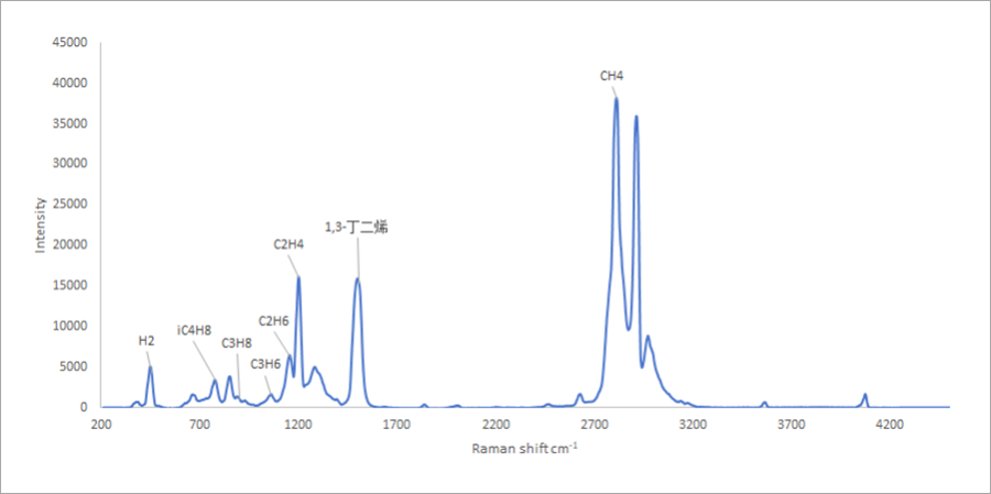 LRGA-3200EX对烯烃裂解气样品进行拉曼光谱扫描分析得到的拉曼光谱图(图4)显示,H2、CH4、C2H4、C2H6、C3H4、C3H6、C3H8和C4s等关键组分具有可区分的特征峰,通过计量特征峰峰高可同时测定各组分气体的含量。