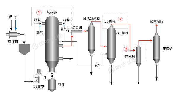 反应后的高温气体进入辐射锅炉和对流锅炉回收热量,产生高压蒸汽。随后,合成气进入旋风分离器以及水洗塔,通过分离与水喷淋的方式进行初步除尘和降温,去除大部分飞灰和熔渣颗粒,形成饱和水煤气,为后续的变换或净化工段做准备。