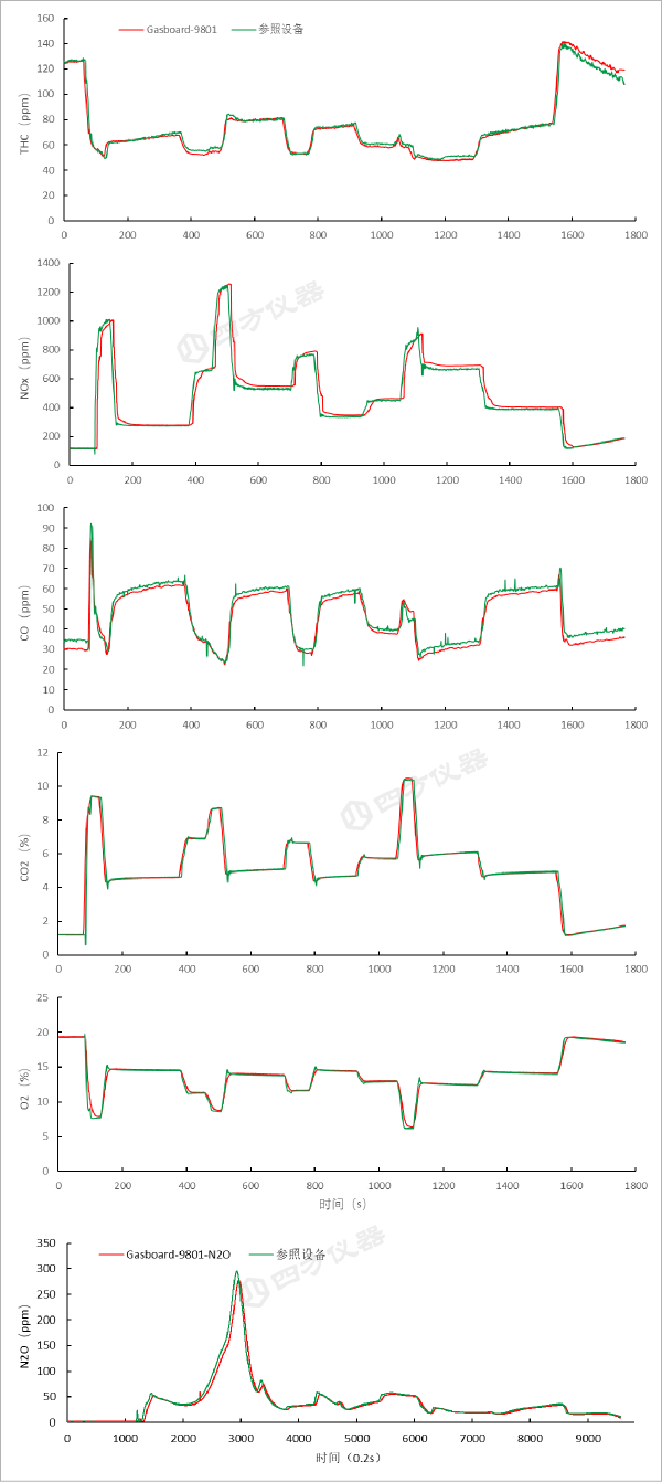 图3 Gasboard-9800系列直采排放测试系统与进口品牌参照设备的重型车柴油机对比排放测试实时数据曲线